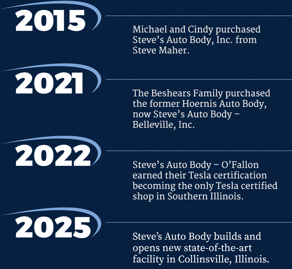 On June 30, 2015, Mike Beshears, a 20 year employee, along with his wife, Cindy, purchased Steve’s Auto Body.